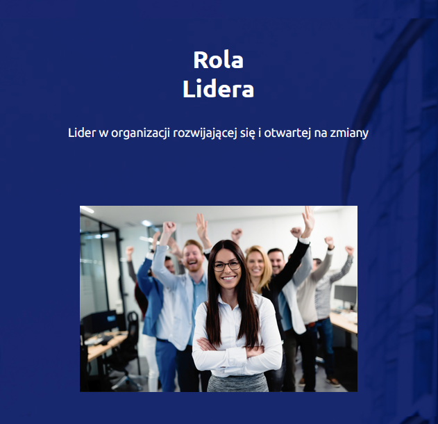 ROLA LIDERA w organizacji rozwijającej się i otwartej na zmiany to szkolenie, którego celem jest dostarczenie wiedzy nt. istoty przywództwa i roli lidera w zarządzaniu organizacją z udziałem zmotywowanych zespołów, osiągających założone cele i z sukcesem realizujących projekty zmian.